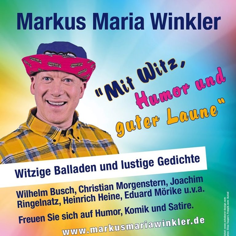 In seinem humorvollen Programm Mit Witz, Humor und guter Laune, präsentiert der Schauspieler Markus Maria Winkler witzige Balladen und lustige Gedichte von Joachim Ringelnatz, Christian Morgenstern, Wilhelm Busch, Annette von Droste-Hülshoff, Manfred Kyber, Heinrich Heine, Theodor Fontane, Marie von Ebner-Eschenbach, Hoffmann von Fallersleben, Eduard Mörike, Fred Endrikat, Friedrich von Schiller und Johann Wolfgang von Goethe. Gewürzt wird sein amüsantes Programm mit heiteren Anekdoten über die Literaten. Freuen Sie sich auf Humor, Komik und Satire. Prädikat: feinsinnig und humorvoll!
