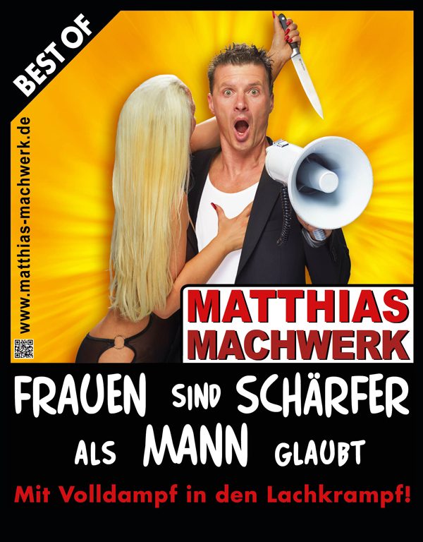 Matthias Machwerk ist der Nahkämpfer des Humors. Er präsentiert Vollgas-Comedy über Männer, Frauen und andere Katastrophen. Warum müssen Männer immer warten und Frauen ständig auf Toilette? Warum wollen Frauen ständig erziehen? Und warum ist verliebt sein so ähnlich wie verrückt sein? Nicht verpassen! Lachen ist gesund, es sei denn, man hat Durchfall.